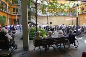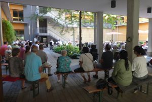 Es ist immer eine ganz besondere Atmosphäre, wenn die katholische Kirchgemeinde Unsere Liebe Frau und das St. Anna gemeinsam Gottesdienst feiern. Am vergangenen Sonntag war es wieder soweit. Endlich, nach über zwei Jahren! Während der Pandemie mussten wir darauf verzichten. 110 Besucherinnen und Besucher folgten der Einladung und kamen zum Gottesdienst mit Pater Otto unter freiem Himmel in den Innenhof vom St. Anna. Dass die Südstadt auch in schwierigen Zeiten zusammensteht, das merkt man immer wieder. „In der Corona Zeit meldete sich Bernhard Kuhn vom Kirchengemeindeteam ULF regelmäßig bei uns“ berichtete Einrichtungsleiter Thomas Mühlhausen zu Beginn des Gottesdienstes. Stefanie Göckede von ULF brachte die Freude zum Ausdruck, dass gemeinsame Aktivitäten wieder möglich sind. Ein wirklich sehr schöner Gottesdienst, der auch in den nächsten Tagen das Gesprächsthema Nr. 1 war.